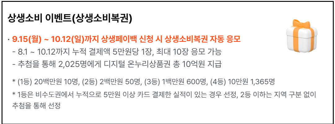 상생페이백을 10월 12일까지 신청하면 자동으로 응모되며, 8월 1일부터 10월 12일까지 인정 사용처에서 누적 카드 결제액 5만 원당 1장씩, 최대 10장의 응모권이 주어집니다.