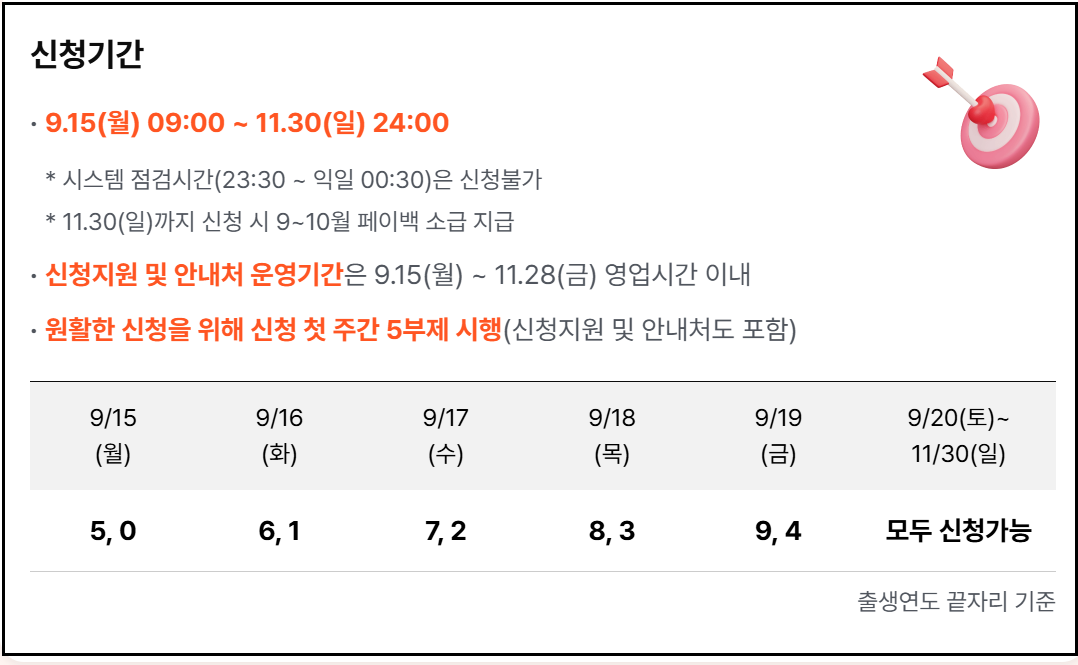 온라인 신청은 상생페이백 누리집에서 가능하며, 첫 주에는 출생연도 끝자리에 따른 5부제가 적용됩니다. 예를 들어 15일은 0과 5, 16일은 1과 6, 17일은 2와 7 순으로 진행되며, 9월 20일부터는 요일 제한 없이 자유롭게 신청할 수 있습니다.