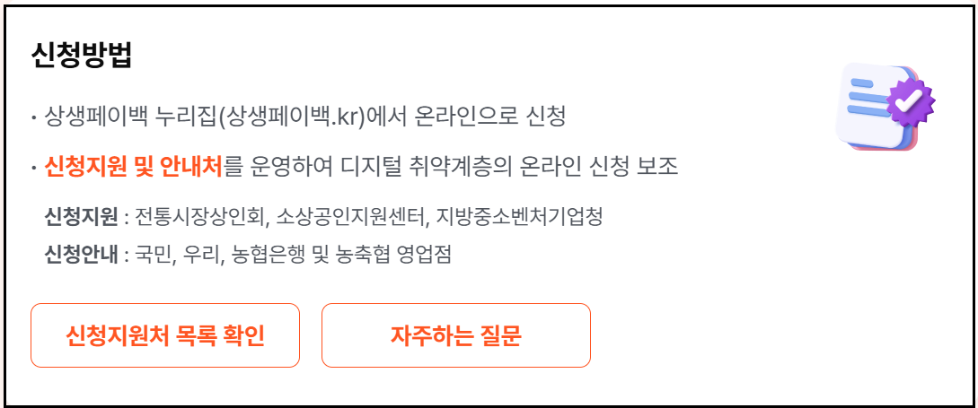 온라인 접근이 어려운 분들은 전통시장 상인회, 소상공인지원센터 등에서 오프라인으로도 신청할 수 있고, 가까운 은행 영업점에서도 안내를 받을 수 있습니다.
