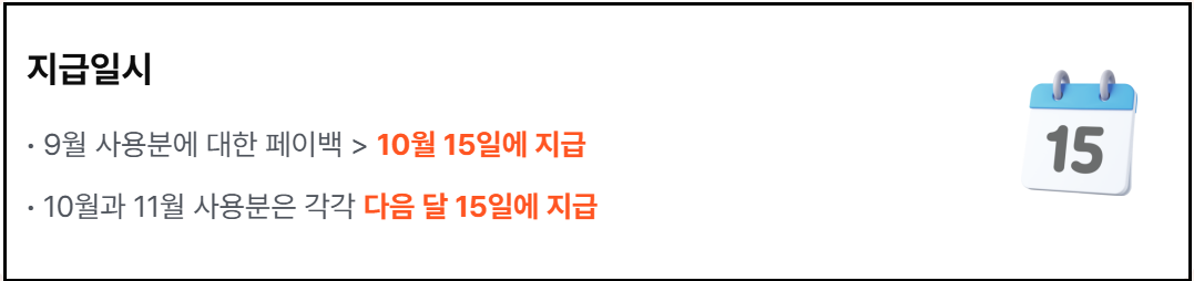 상생페이백 환급은 월별 소비 증가분을 기준으로 산정됩니다. 9월분 소비 증가액에 대한 환급은 10월 15일부터 순차적으로 지급되며, 10월과 11월분도 각각 다음 달 15일부터 지급됩니다.