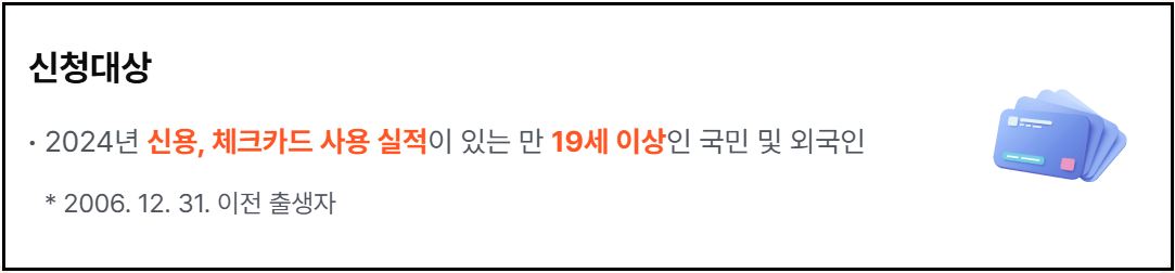 기준일은 2024년 12월 31일이므로, 2006년 12월 31일 이전 출생자는 모두 해당됩니다. 신청은 반드시 본인 명의의 신용·체크카드로만 가능하며, 대리 신청은 허용되지 않습니다.