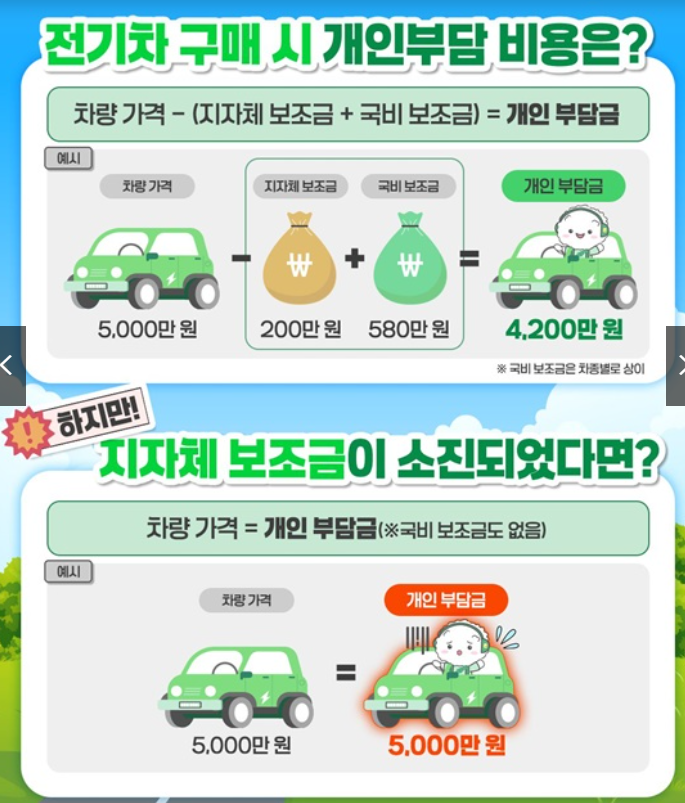 차량 가격 − (지자체 보조금 + 국비 보조금 + 제조사 할인 등 인센티브) = 개인 부담금