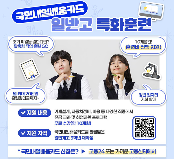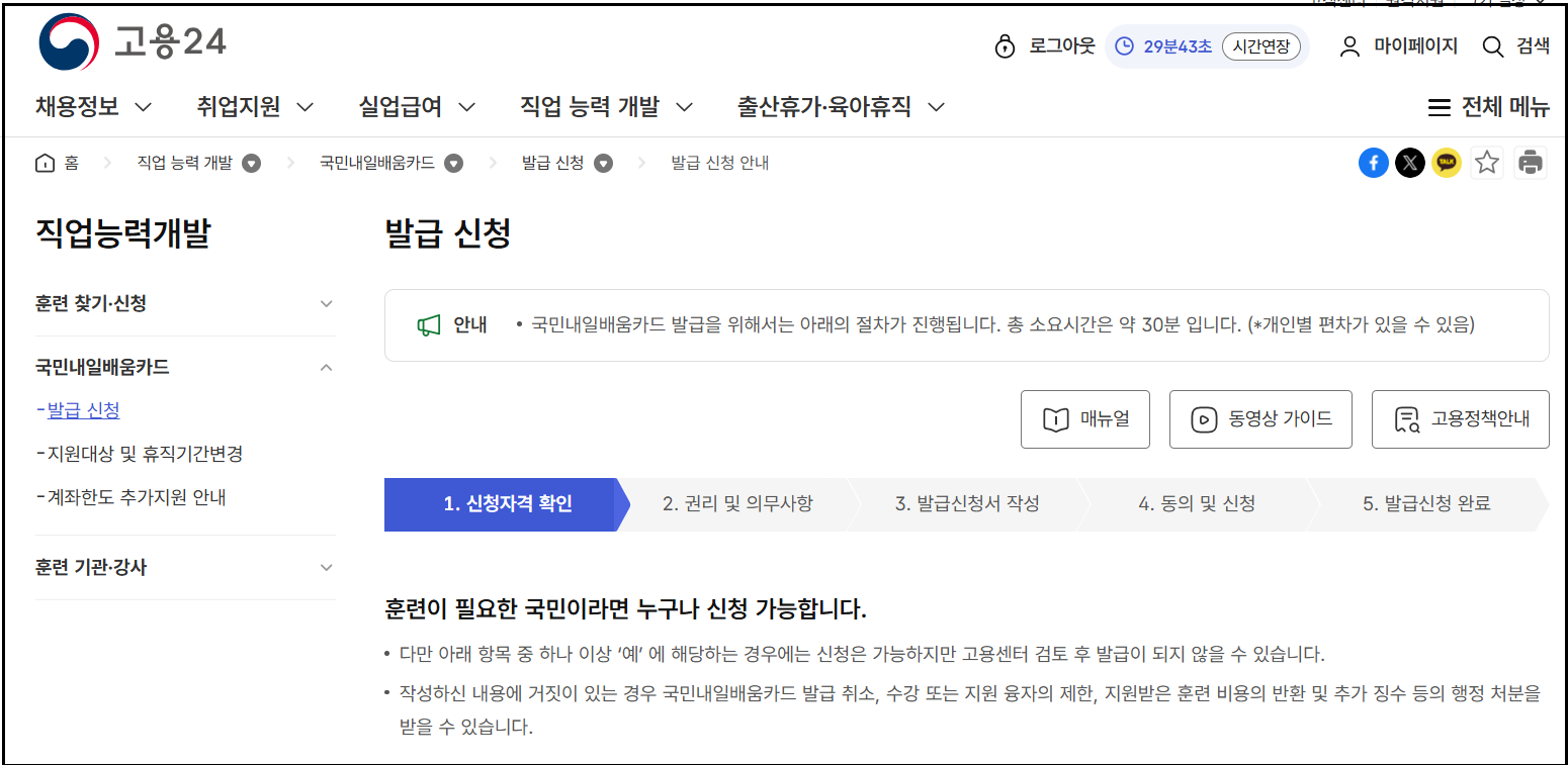 고용노동부 통합 플랫폼인 ‘고용24’에 접속해 국민내일배움카드 발급 신청을 하면 됩니다.