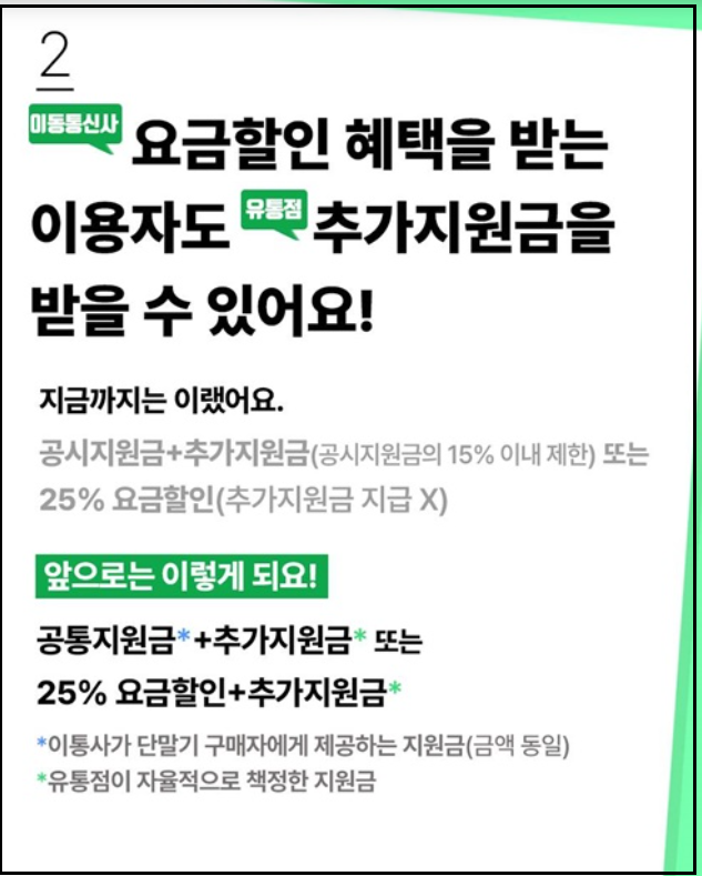 이제 이용자는 두 가지 방식 모두에서 혜택을 받을 수 있습니다. 하나는 공통지원금과 유통점의 추가지원금을 조합하는 방식이고, 다른 하나는 선택약정 할인과 유통점 보조금을 함께 받는 방식입니다. 단말기 구매자가 자신에게 유리한 방식으로 지원을 선택할 수 있게 된 것입니다.