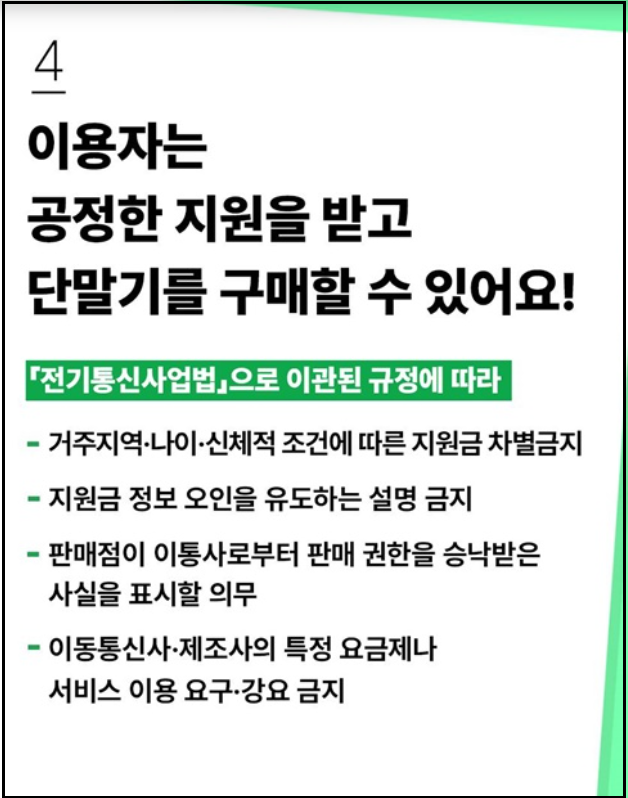 이러한 규정들은 이용자가 공정한 조건에서 단말기를 구매할 수 있도록 돕기 위한 것입니다. 특히 정보 취약계층이나 고령 소비자의 경우, 다양한 판매처에서 지원금 조건이 제각각인 상황에서 피해를 입을 가능성이 크기 때문에, 가족이나 지인과 함께 조건을 비교하고 안내받는 것이 바람직합니다.
