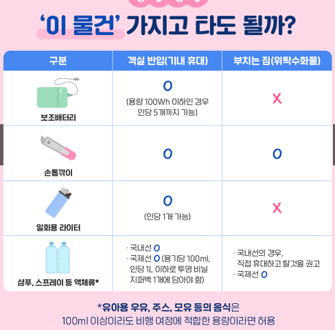 특히 보조배터리나 액체류처럼 대부분의 여행자가 챙기는 물품은 반드시 규정을 확인하고 준비해야 합니다.