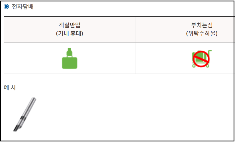 전자담배는 일반 흡연 도구와 달리 리튬 배터리를 내장하고 있기 때문에 반드시 기내에 휴대해야 합니다.