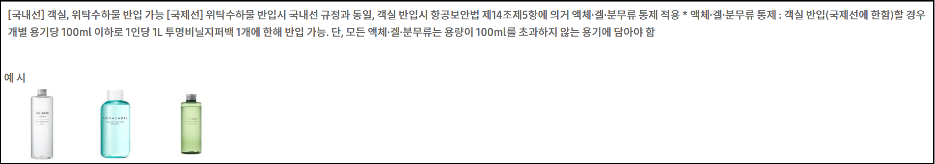 여행객들이 가장 많이 걸리는 부분이 바로 액체류 반입 규정입니다.