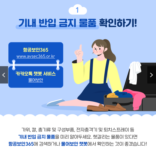 여행의 시작은 가볍고 즐겁게 이루어져야 합니다. 출발 전 잠시 시간을 내어 비행기탑승시금지물품을 점검한다면, 여행은 한층 더 안전하고 여유롭게 시작될 수 있습니다.