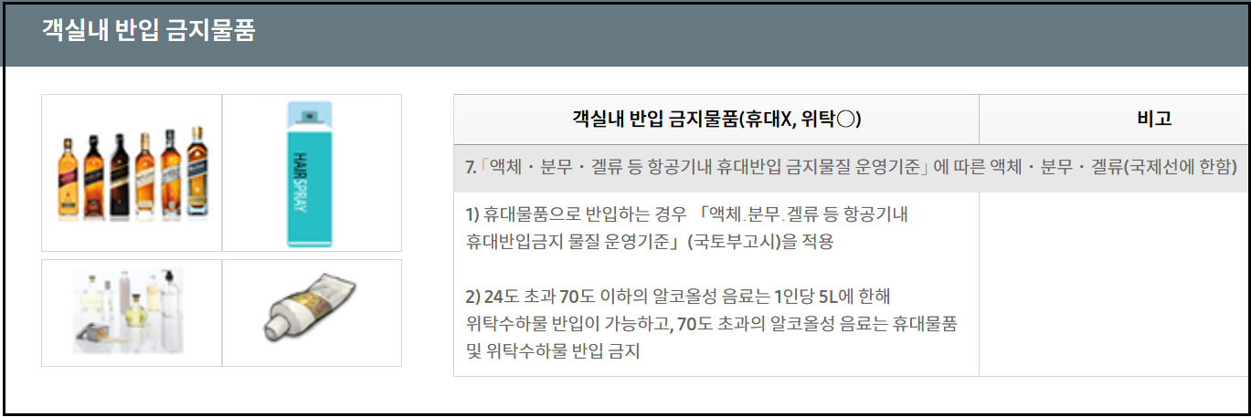 객실내 반입 금지물품 - 액체·분무·겔류