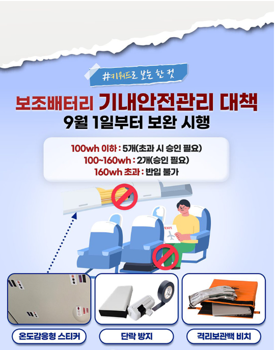 규정의 핵심은 보조배터리와 예비 리튬 배터리는 반드시 기내에 휴대해야 하며, 위탁수하물에 넣을 수 없다는 점입니다. 수하물로 부치면 운항 중 화재 발생 시 진화가 어렵기 때문입니다.