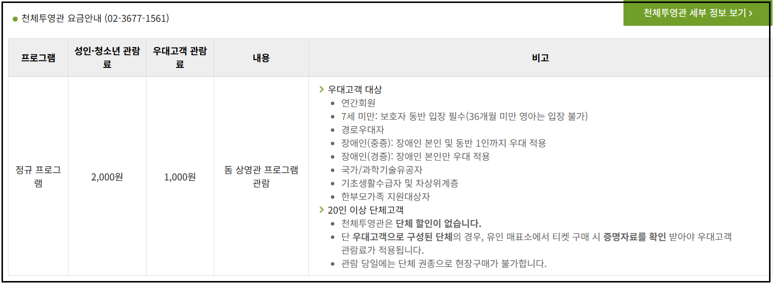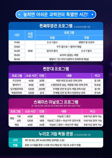 - 주말: 11시(생명의 빛 오로라), 13시(우주 끝으로+별자리 해설), 14시(3-2-1 발사), 15시(보이저), 16시(별빛이 그린 이야기)