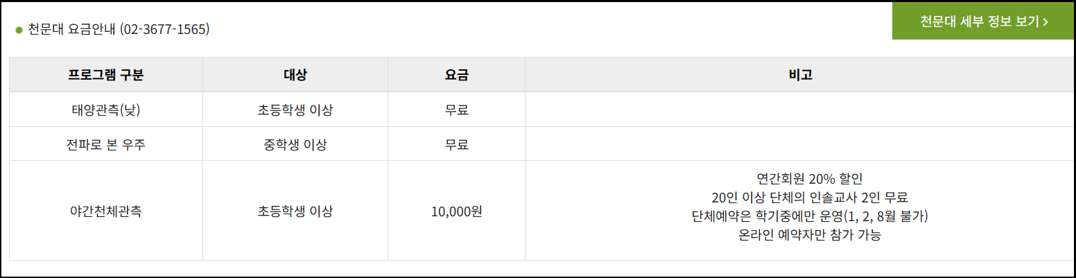 - 특별관측회: 연 5회, 특별한 천문현상 관측(120분)
