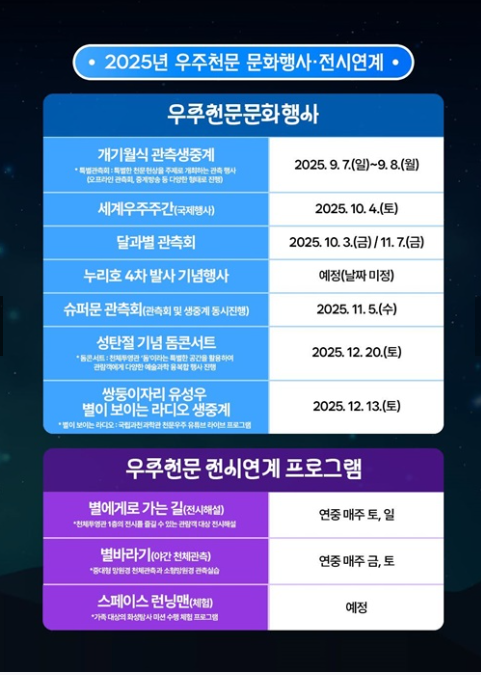 국립과천과학관에서는 특별한 우주 현상과 연계한 문화 행사를 꾸준히 진행합니다. 올해 예정된 주요 행사 일정은 다음과 같습니다.