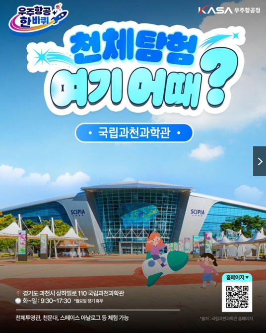 별빛 가득한 천체투영관, 직접 체험하는 우주 훈련, 실제 크기의 누리호까지… 아이가 평생 기억할 하루를 선물하고 싶으시다면, 이번 주말 과천으로 떠나보세요!