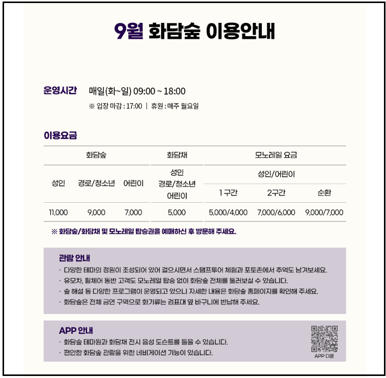 추천 동선은 아침 일찍 입장 후 화담채를 관람하고, 주요 테마원을 천천히 둘러본 뒤 점심 이후 모노레일을 타고 정상부 전망대에 올라 숲 전체를 조망하는 방식입니다.