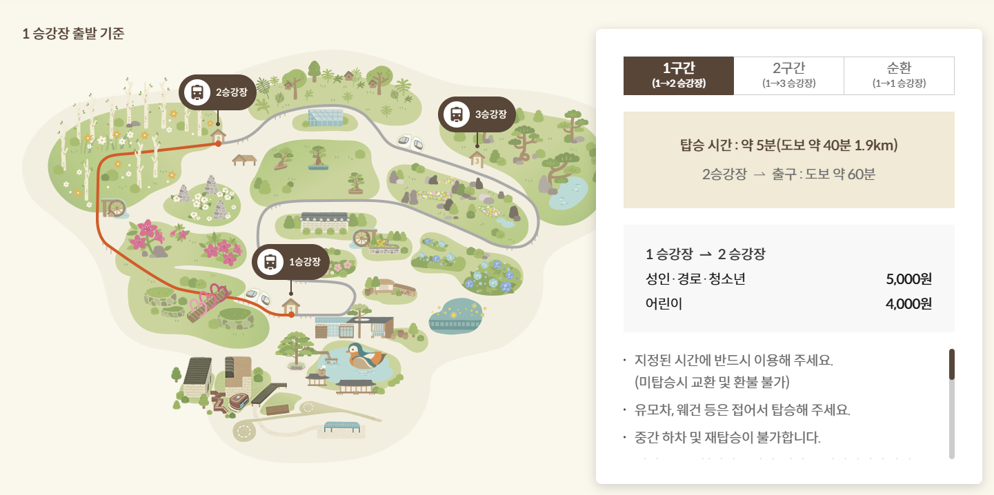 수목원은 지형이 넓고 경사가 있어 모든 구간을 도보로만 둘러보기에는 체력 소모가 크기 때문에, 모노레일을 이용하면 훨씬 편하게 주요 포인트를 관람할 수 있습니다.