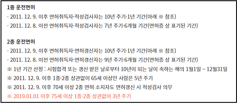 특히 65세 이상 고령 운전자는 갱신 주기가 단축되며, 70세 이상부터는 적성검사나 건강검진 등 별도의 절차를 거쳐야 합니다.