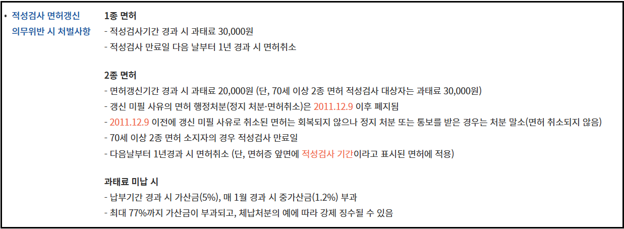 다만 갱신 기간을 넘기면 과태료가 부과되고, 장기간 미갱신 시에는 면허가 취소될 수 있으므로 반드시 정해진 기한 내에 신청해야 합니다.