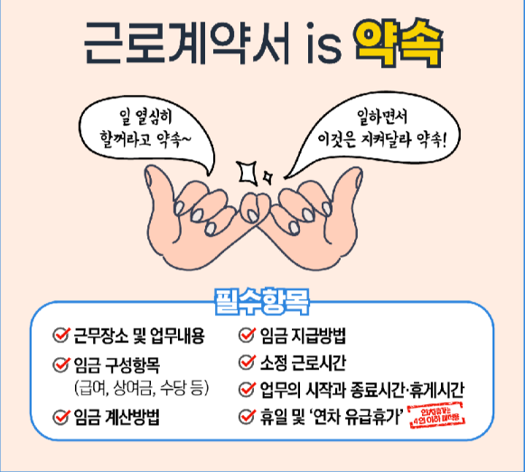 둘째, 계약서에는 임금, 지급일, 근무시간, 휴게시간, 휴일·휴가, 근무 장소, 업무 내용 등 필수 항목이 모두 포함되어야 하며, 실제 근로조건과 불일치하지 않도록 주의해야 합니다.