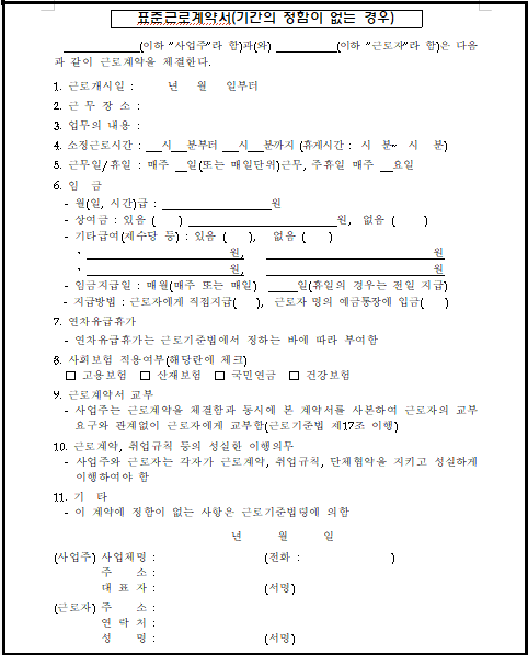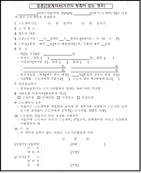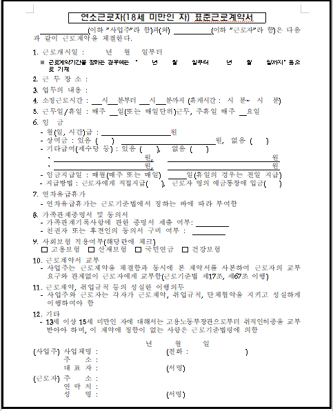 따라서 양식을 내려받은 후 사업장의 특성에 맞게 수정·보완하여 근로자와 서명·날인을 완료하고, 그 사본을 근로자에게 교부하는 것이 중요합니다.