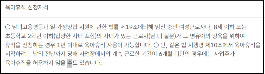 예를 들어 직장인 B씨가 출산 후 바로 육아휴직을 들어가려면 출산일 기준으로 고용보험 가입 이력이 최소 6개월 이상 있어야 하며, 자녀가 만 9세가 넘는 경우에는 제도를 신청할 수 없습니다.