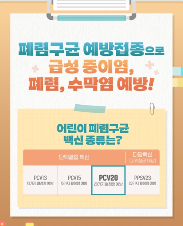 - 최근에는 PCV20 백신이 등장하면서 한 번 접종으로 넓은 범위의 폐렴구균 감염을 예방할 수 있다는 점에서 관심이 높아지고 있습니다.