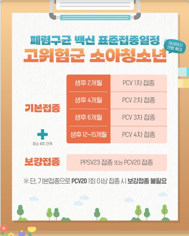 - 기본 접종은 위와 같으며, 이후 최소 8주 간격으로 PPSV23 또는 PCV20을 보강 접종합니다. 단, 기본 접종에서 PCV20을 이미 1회 이상 맞았다면 보강 접종은 생략할 수 있습니다.