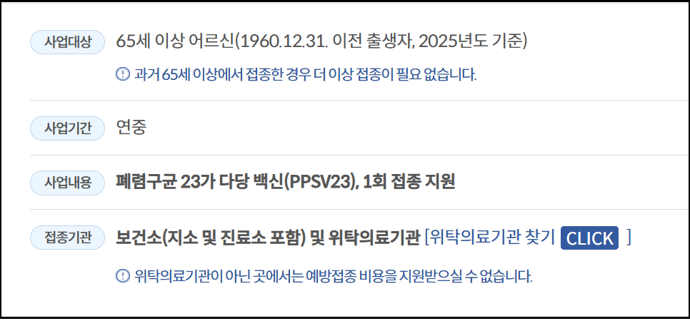 - 어르신 무료 접종 대상 : 만 65세 이상 모든 어르신은 PPSV23 백신을 1회 무료 접종할 수 있습니다. 다만 과거에 - 동일한 백신을 접종한 이력이 있다면 추가 무료 접종은 불가능할 수 있으므로, 반드시 접종 이력을 확인해야 합니다.