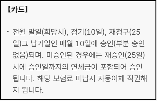카드 자동이체는 일반적인 은행계좌 자동이체보다 출금 시점이 늦어지는 경우가 있어, 출금 예정일에 카드 한도 초과 등의 문제가 발생하면 미납으로 처리될 수 있습니다. 이런 경우, 별도로 연체료가 발생할 수 있으니 카드 상태를 꼭 사전에 확인해두셔야 합니다.