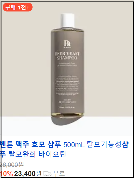 - 대용량 1리터 제품으로, 맥주효모와 비오틴이 함께 함유되어 있습니다. 탈모 증상 완화 기능성 인증을 받은 제품이며, 사용감이 부드럽고 향이 순한 편입니다.